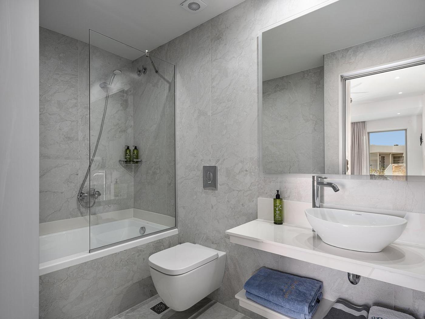 Luxury Suite with Private Pool. Experience ultimate comfort and privacy in our Lux Suite, featuring a private pool with stunning views. This spacious suite offers a separate bedroom with either two single beds or one king-size bed, a cozy living area with sofa beds, and two modern bathrooms, one with a bathtub and the other with a walk-in shower. Stepyour furnished terrace and unwind by your exclusive-use pool, the perfect setting for relaxing in style. Amenities include a 43" flat-screen TV, minibar (stocked upon arrival), Nespresso coffee machine, pool towels, bathrobes, and slippers, ensuring a truly comfortable and carefree stay. ;
